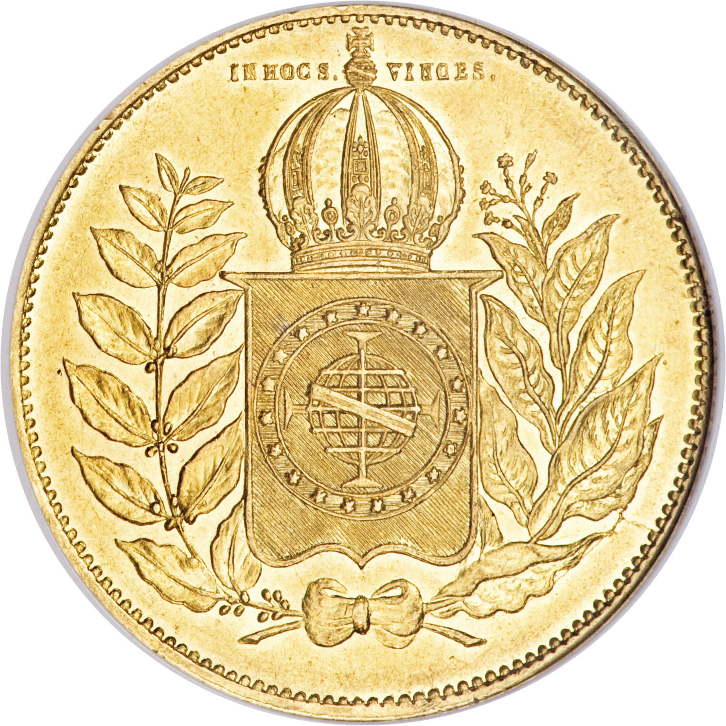 Опис: Герб Другої Бразильської імперії, над яким розміщено напис: IN HOC S. VINCES.