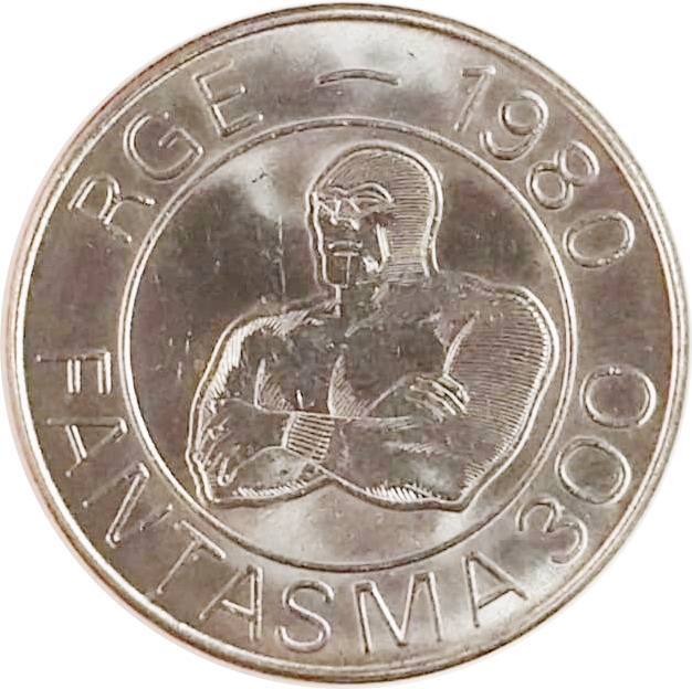 Опис: Рельєфний край. По контуру краю розміщені написи: RGE - 1980 (зверху); FANTASMA 300 (знизу). У центрі, оточений суцільним кільцем, зображений бюст супергероя Фантома, який дивиться вліво і тримає руки схрещеними.