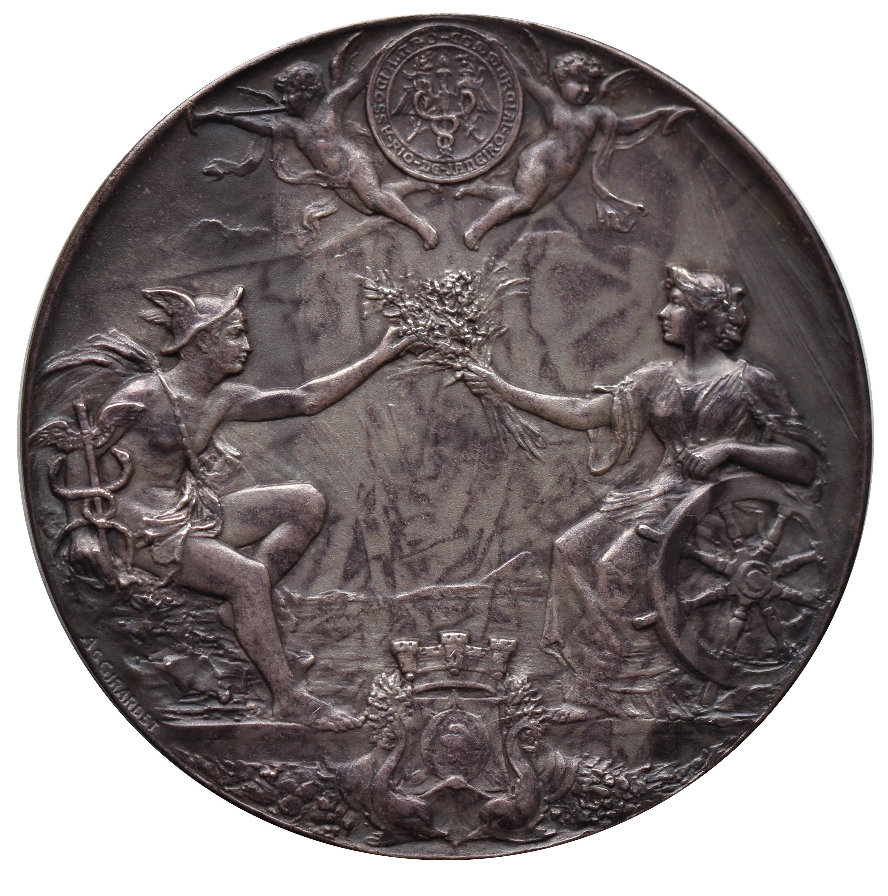Опис: Затока Гуанабара, праворуч — фігура жінки, що сидить, спираючись лівою рукою на колесо, а правою рукою вона підносить квіти Меркурію. У верхній частині — емблема Торгової асоціації, по боках якої стоять два херувими, оповиті драперією: один херувим тримає трубу, а інший — запальничку. У нижній частині — герб міста Ріо-де-Жанейро.