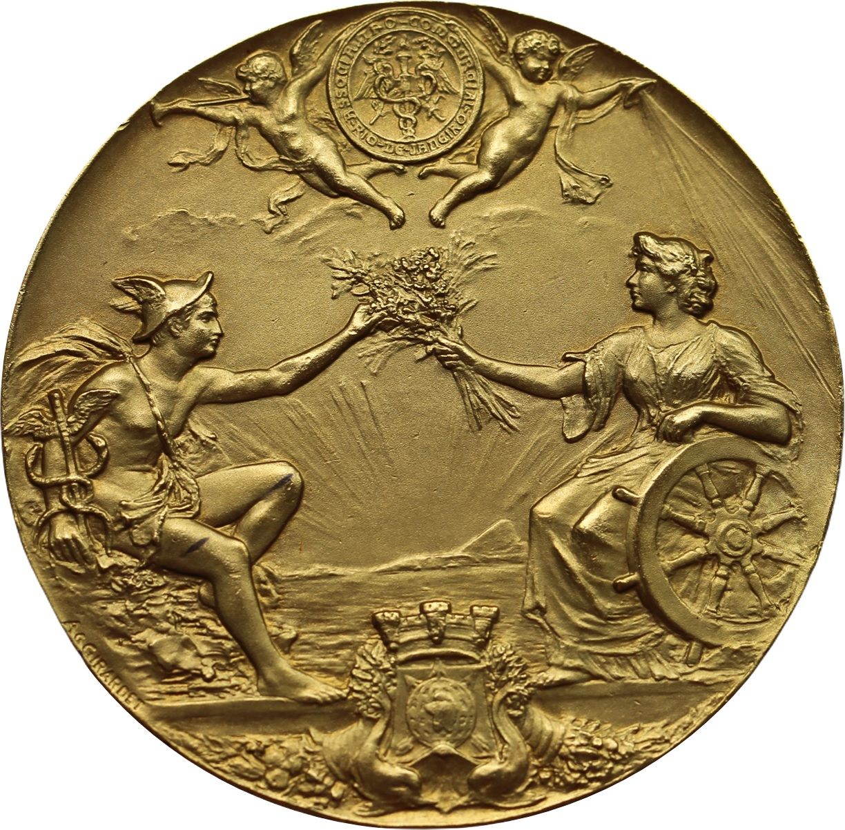 Опис: Затока Гуанабара, праворуч — фігура жінки, що сидить, спираючись лівою рукою на колесо, а правою рукою вона підносить квіти Меркурію. У верхній частині — емблема Торгової асоціації, по боках якої стоять два херувими, оповиті драперією: один херувим тримає трубу, а інший — запальничку. У нижній частині — герб міста Ріо-де-Жанейро.