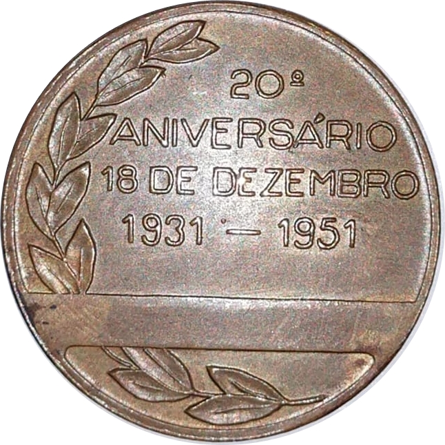 Опис: Рельєфний край. У правому верхньому куті поля, зверху вниз, читається напис: 20 º ANIVERSÁRIO 18 DE DEZEMBRO 1931 - 1951. Під написом, перетинаючи горизонтально чверть висоти монети, розташована смуга. Починаючи від вирізу, гілка лавра, що спадає вліво.