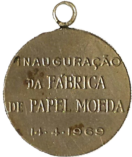 Опис: Однотонний фон з рельєфним написом, що читається зверху вниз, зі словами INAUGURAÇÃO DA FÁBRICA DE PAPEL MOEDA, датований 14.4.1969.