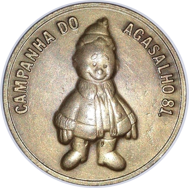 Опис: У центрі, у високому рельєфі, зображено талісман кампанії 1981 року, яку проводив уряд штату Сан-Паулу (Бразилія). Під зображенням розміщено підпис: КАМПАНІЯ AGASALHO 81.