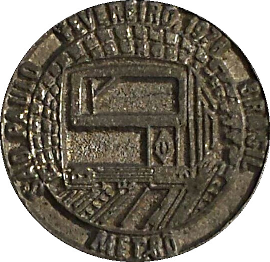 Опис: На монеті вибито напис: SÃO PAULO FEVEREIRO 1978 BRASIL METRÔ. У центрі, також у рельєфі, зображено передню частину вагона локомотива, що використовується в метрополітені Сан-Паулу, Бразилія, на рейках.