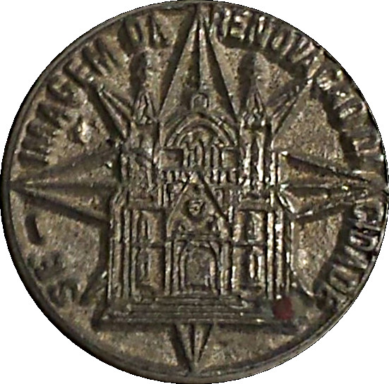 Опис: На монеті вибитий напис: SÉ - IMAGEM DA RENOVAÇÃO DA CIDADE. У центрі, також у рельєфі, зображена восьмикутна зірка, накладена на фасад собору на площі Кафедрального собору в Сан-Паулу, Бразилія.