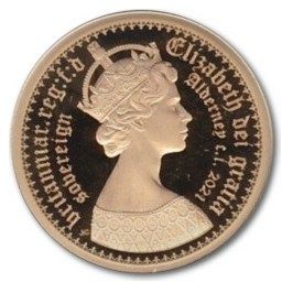 1 суверен — Єлизавета II (готичний — чотиричастинний герб; золотий пробний) 2021 – 2021 Олдерні