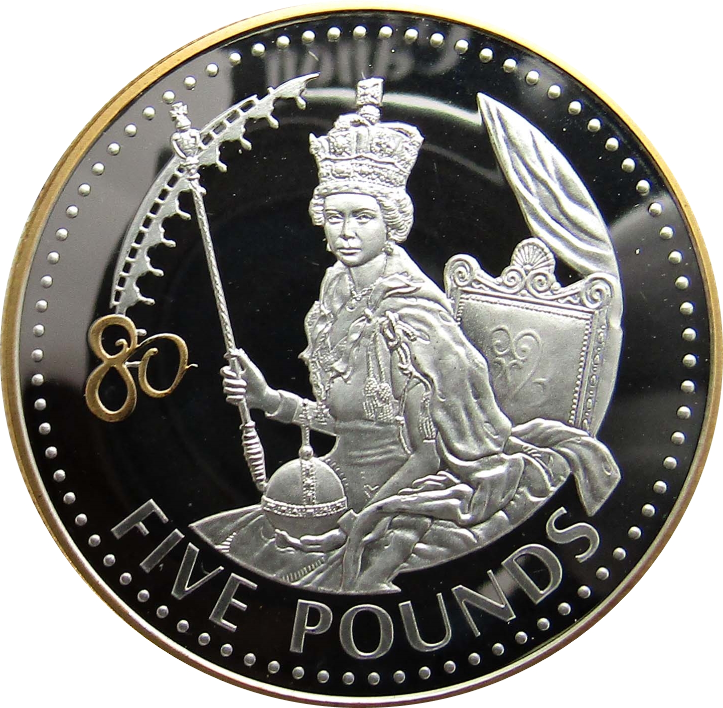 Назва: 5 фунтів — Єлизавета II (День народження королеви Єлизавети II; позолочена)