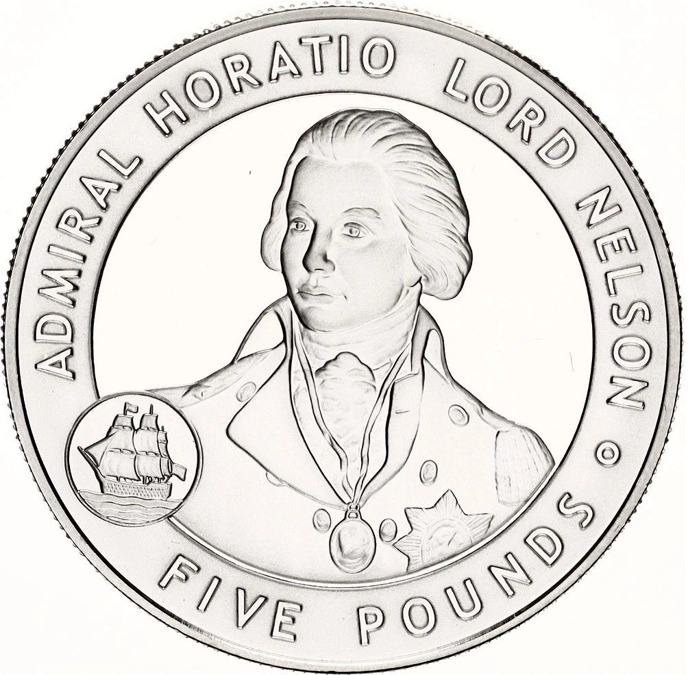 Назва: 5 фунтів — Єлизавета II (адмірал Гораціо Лорд Нельсон; срібна проба)
