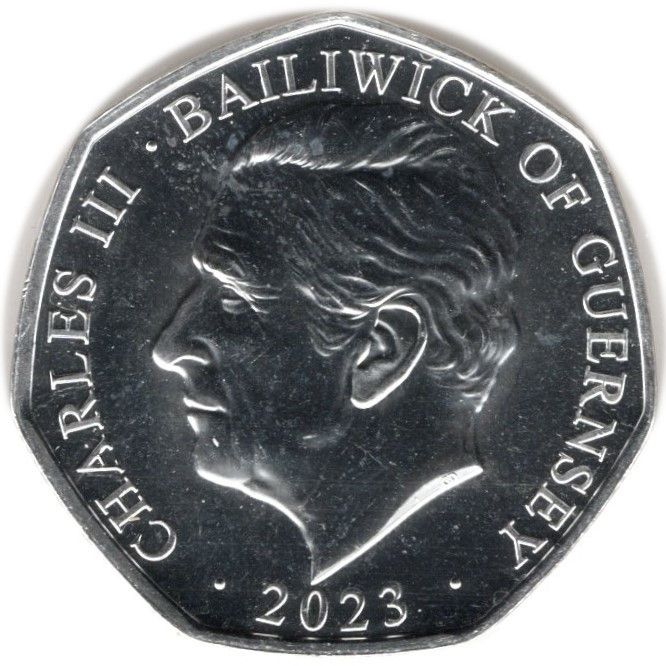 50 пенсів — Карл III (коронаційні регалії — старовинна коронаційна ложка; срібло/позолота) 2023 – 2023 Гернсі
