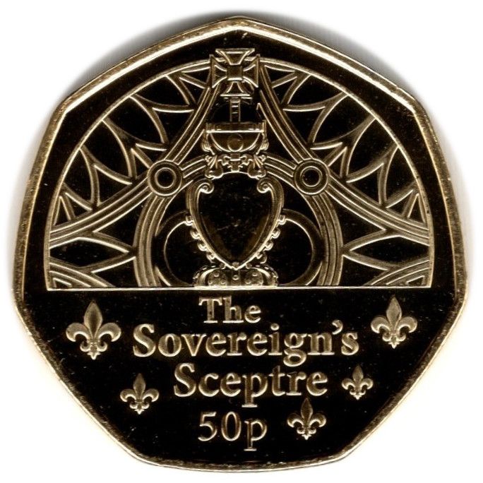Назва: 50 пенсів — Карл III (коронаційні регалії — скіпетр монарха; позолочений)