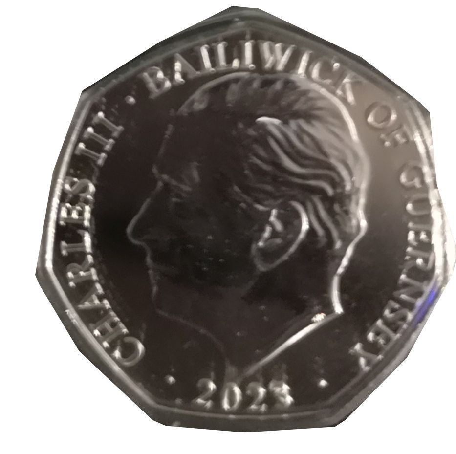 50 пенсів — Карл III (коронаційні регалії — скіпетр монарха; срібло/позолота) 2023 – 2023 Гернсі