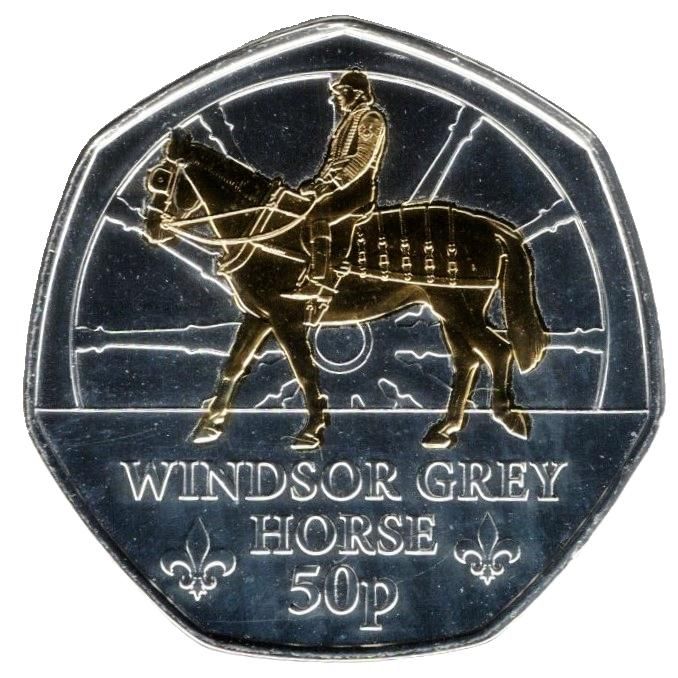 Назва: 50 пенсів — Карл III (Королівські конюшні — Віндзорський сірий кінь; срібло/позолота)