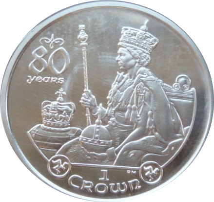 1 крона — Єлизавета II (80-річчя королеви Єлизавети II — коронація 1953 року) 2006 – 2006 Острів Мен