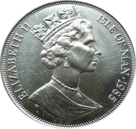 1 крона — Єлизавета II (королева-мати в молодості) 1985 – 1985 Острів Мен