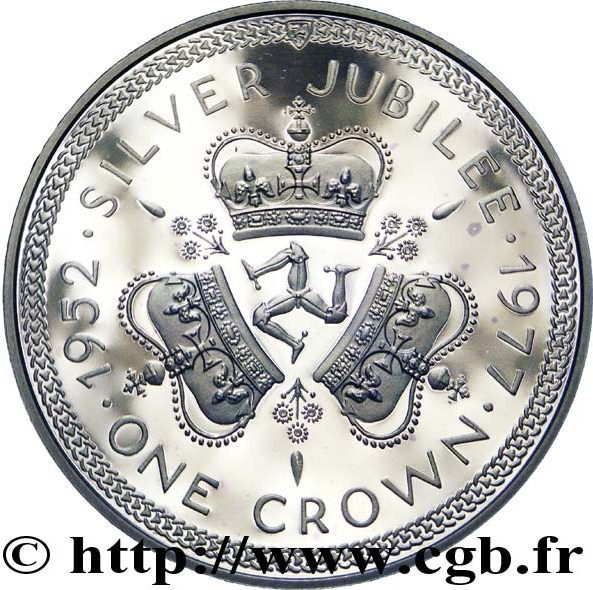 1 крона — Єлизавета II (Срібний ювілей; срібна емісія) 1977 – 1977 Острів Мен