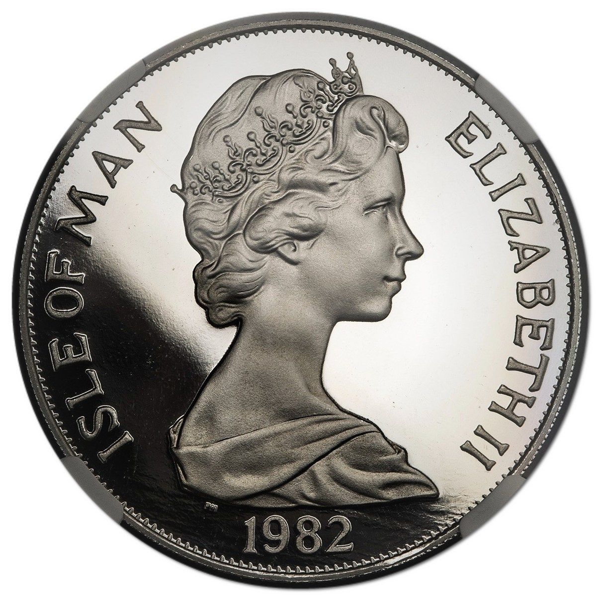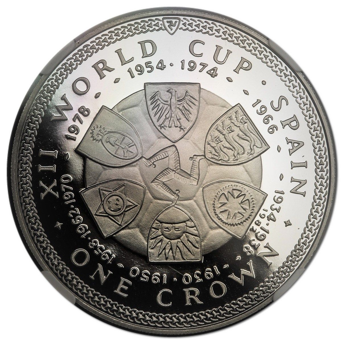 1 крона — Єлизавета II (Чемпіонат світу з футболу в Іспанії — оновлені переможці; платинова проба) 1982 – 1982 Острів Мен