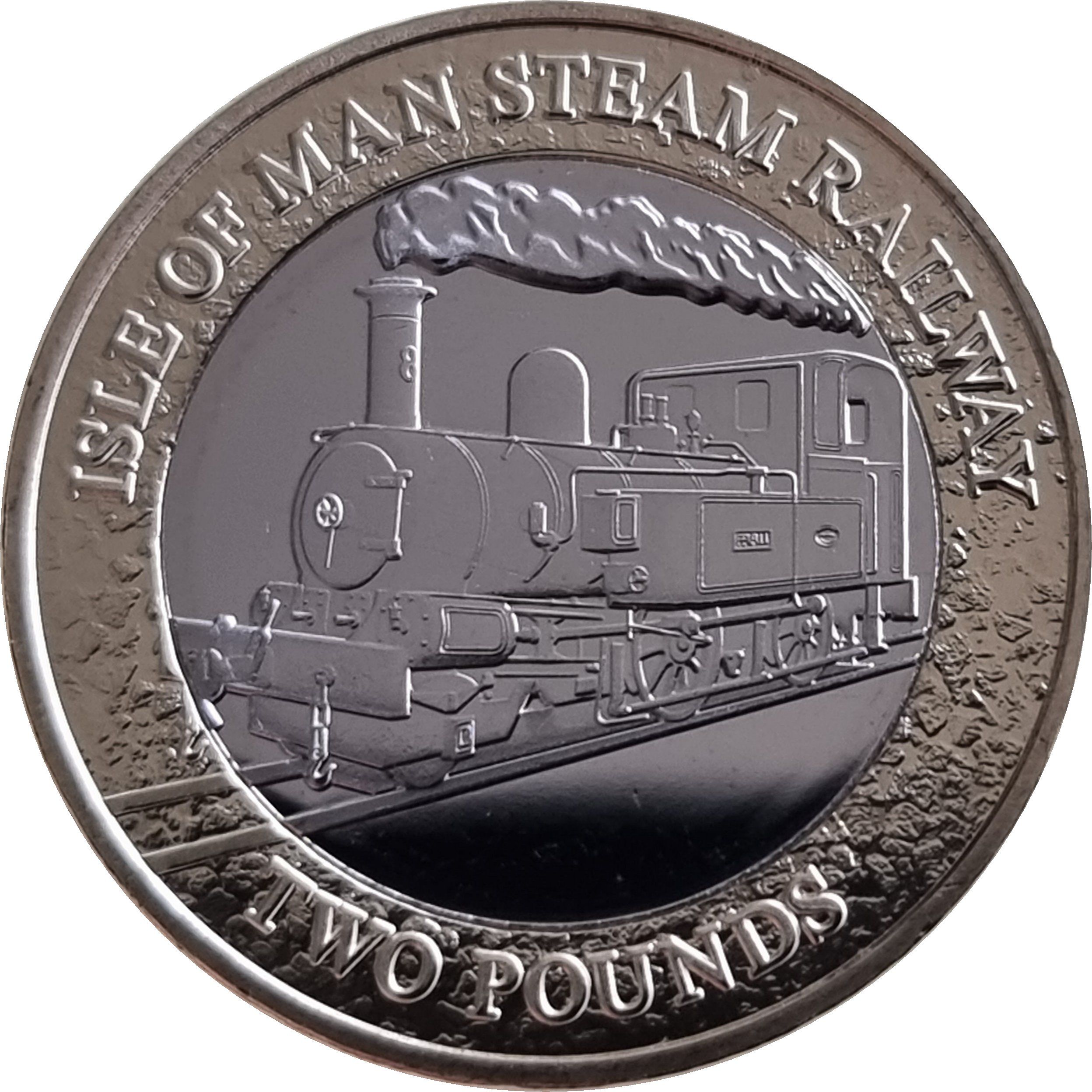 Опис: У центральному колі зображено паровоз «Фенелла» залізниці острова Мен, присвячений 150-річчю залізниці острова Мен. У верхній частині розміщено напис «ISLE OF MAN STEAM RAILWAY» (Залізниця острова Мен), а в нижній — номінал монети.