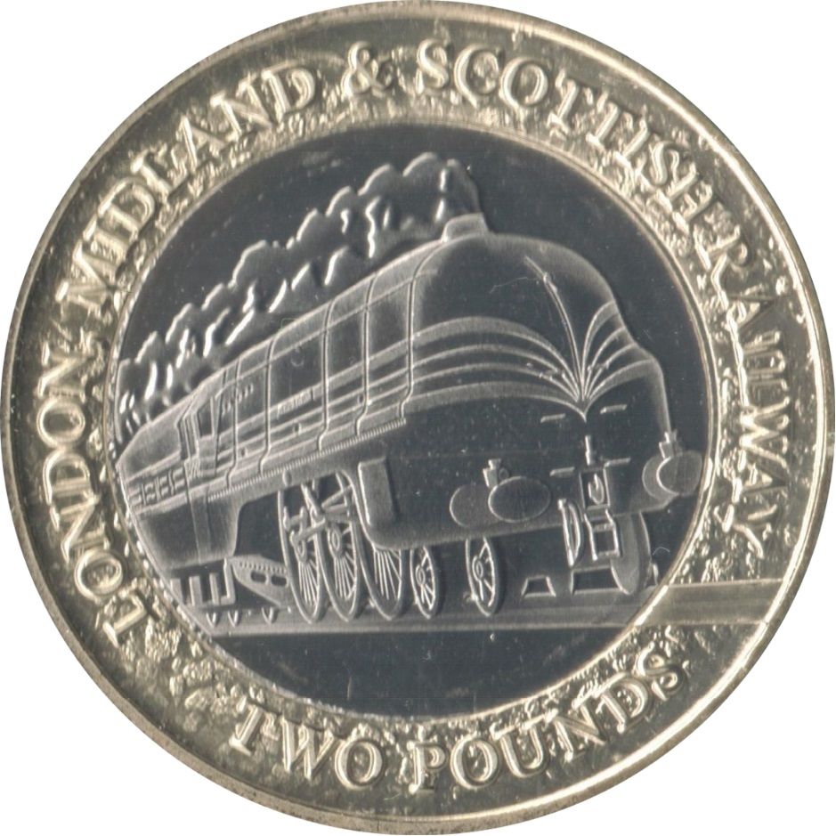 Опис: У центральному колі зображено LMS «Дючеса Гамільтона», збережений паровоз, побудований у 1938 році та виставлений у Національному залізничному музеї. У верхній частині розміщено напис LONDON, MIDLAND & SCOTTISH RAILWAY, а в нижній — номінал монети.