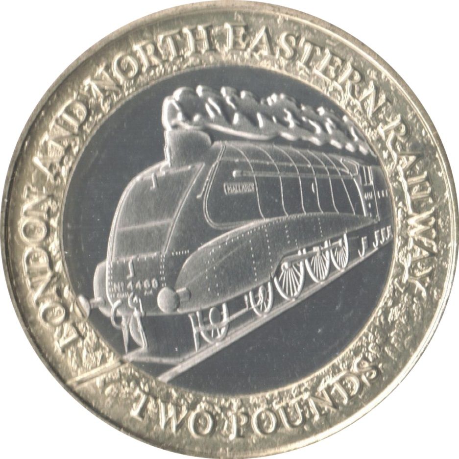 Опис: У центральному колі — LNER «Mallard» — найшвидший паровоз у світі. У 1938 році він розвинув швидкість 126 миль на годину, що є рекордом швидкості для паровозів, який досі не побитий. Напис у верхній частині, номінал у нижній частині.