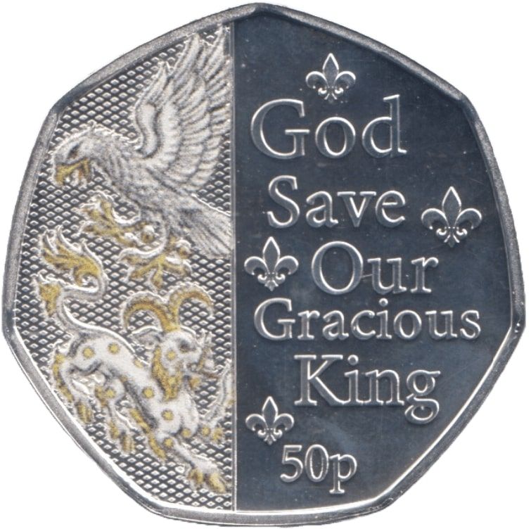 Назва: 50 пенсів — Карл III (Гімн — «Боже, бережи нашого милостивого короля»; срібна кольорова монета)