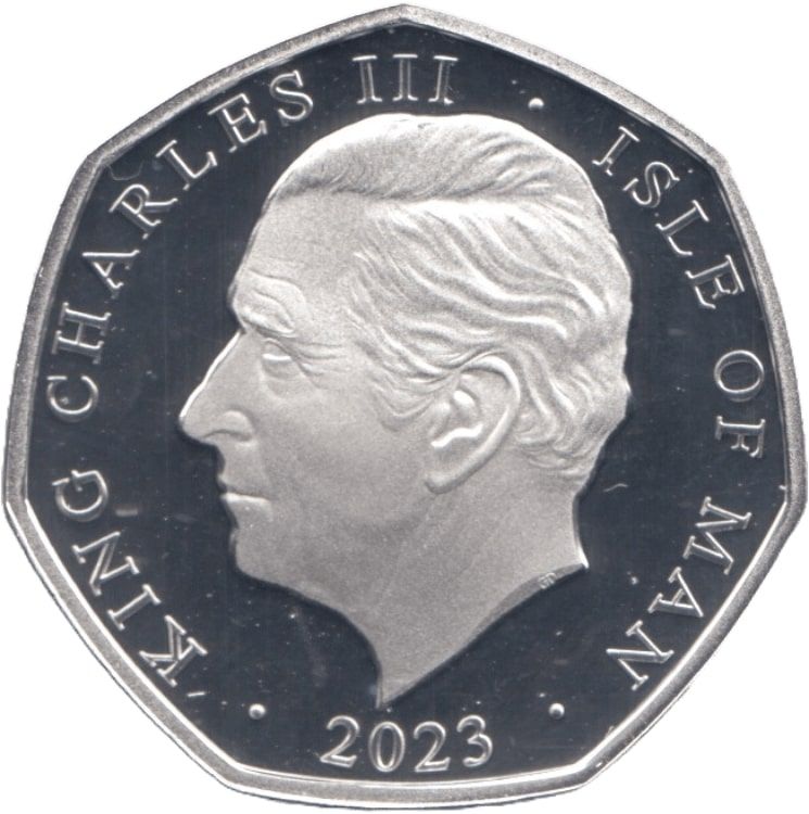 50 пенсів — Карл III (Гімн — «Боже, бережи короля»; срібна кольорова монета) 2023 – 2023 Острів Мен