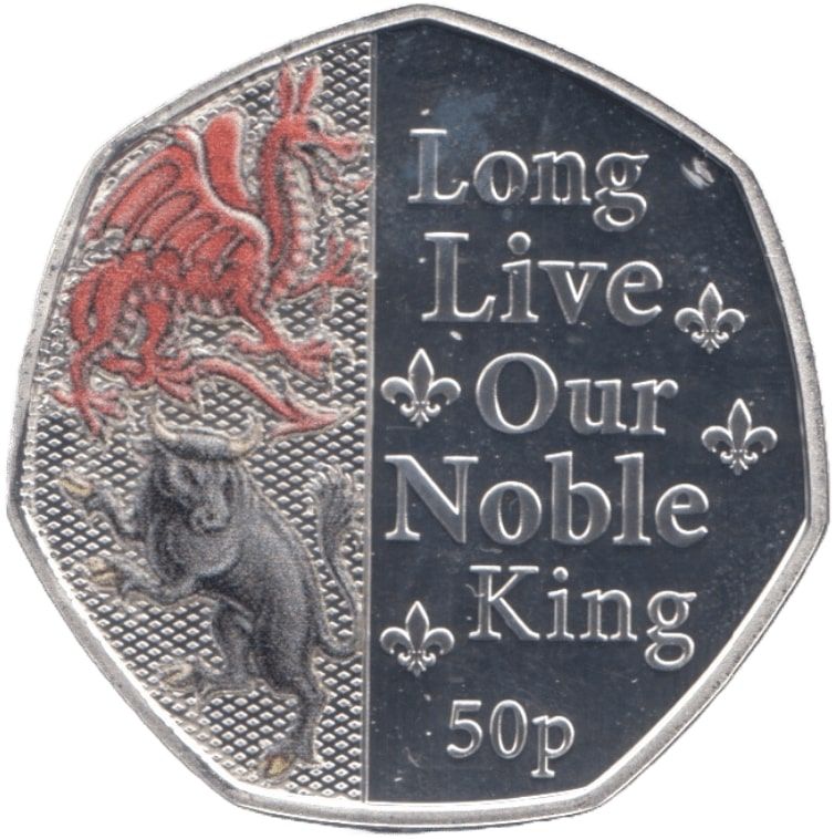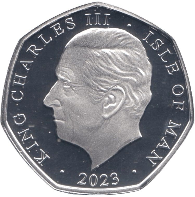 50 пенсів — Карл III (Гімн — Хай живе наш благородний король; срібна кольорова монета) 2023 – 2023 Острів Мен