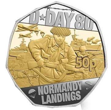 50 пенсів — Карл III (висадка в Нормандії в день Д; срібна пробна монета з позолотою) 2024 – 2024 Острів Мен