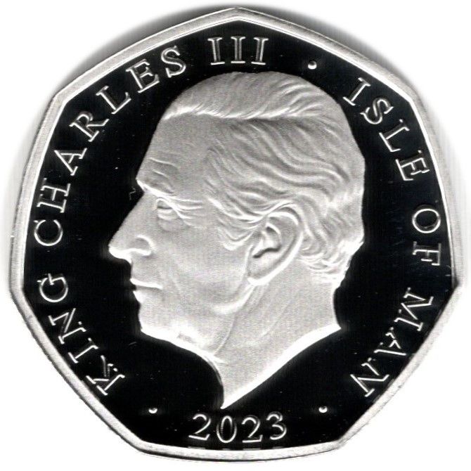 50 пенсів — Карл III (Юрський період у Британії — Сцелідозавр; срібна монета) 2023 – 2023 Острів Мен