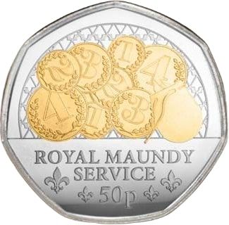 Назва: 50 пенсів — Карл III (перший рік правління короля — Королівська служба Маунді; срібна монета, позолочена золотом)