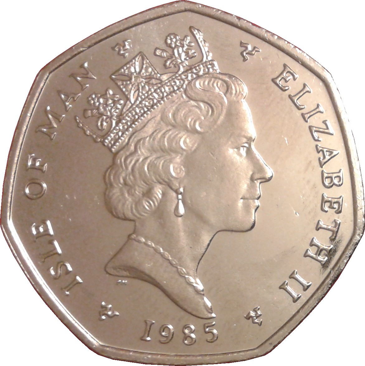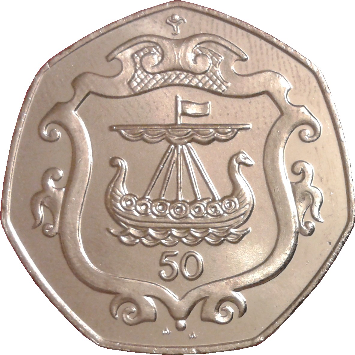 50 пенсів — Єлизавета II (вікінгський корабель на щиті) 1985 – 1987 Острів Мен