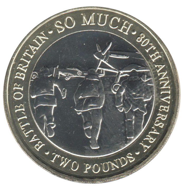 Опис: Троє льотчиків йдуть по злітно-посадковій смузі до своїх літаків, девіз, тема та номінал «БИТВА ЗА БРИТАНІЮ • ТАК БАГАТО • 80-РІЧЧЯ • ДВА ФУНТИ»