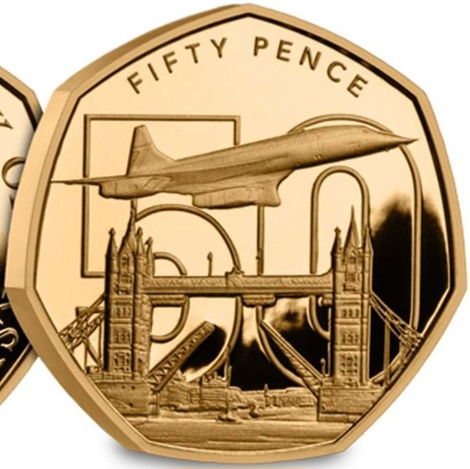 Назва: 50 пенсів — Карл III (50-та річниця «Конкорду» — Тауерський міст, Лондон; золото)