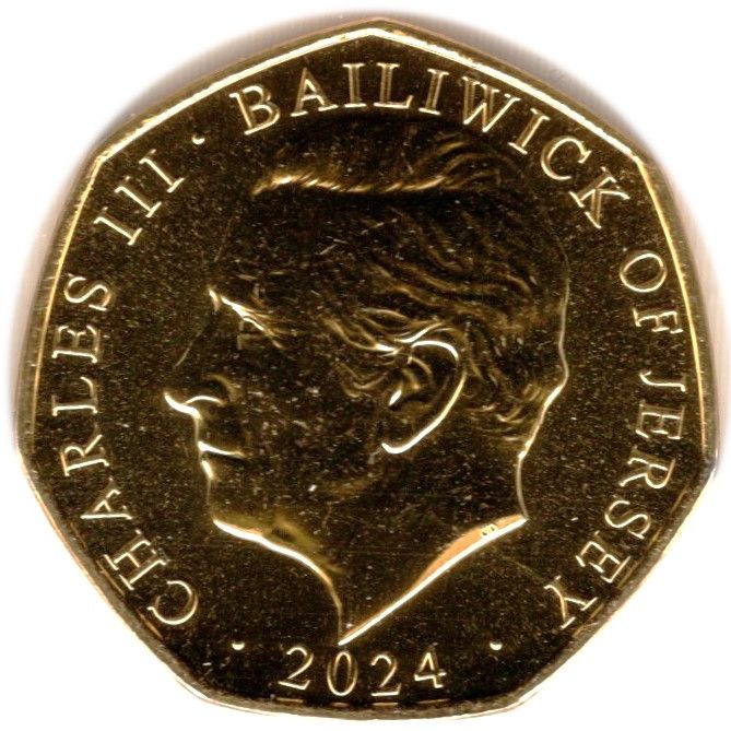 50 пенсів — Карл III (королівська резиденція — Сандрінгамський палац; позолочена) 2023 – 2023 Джерсі