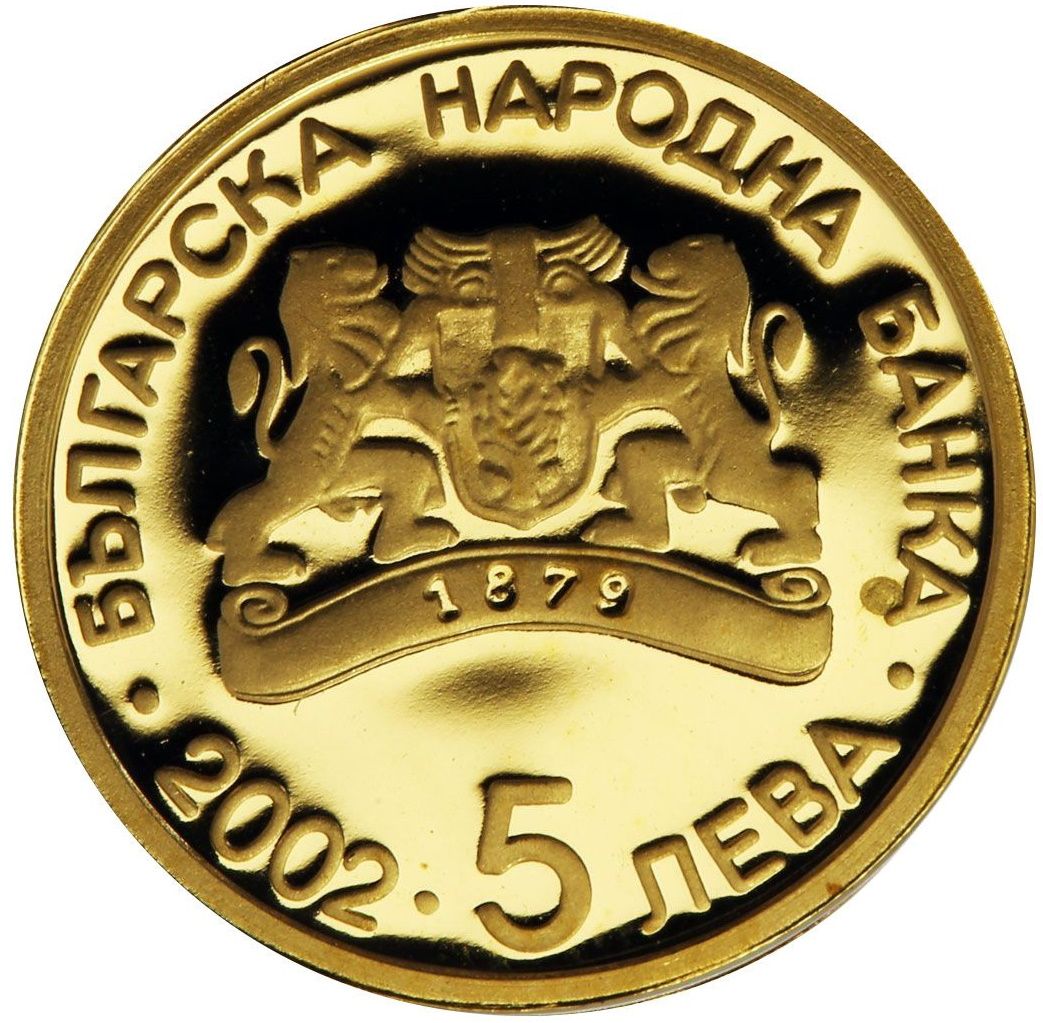 Опис: На аверсі монети зображено логотип Болгарського національного банку з написом «1879» на стрічці. По колу розміщено напис «БЪЛГАРСКА НАРОДНА БАНКА» (Болгарський національний банк), номінальна вартість монети «5 ЛЕВА» (5 левів) та рік випуску.