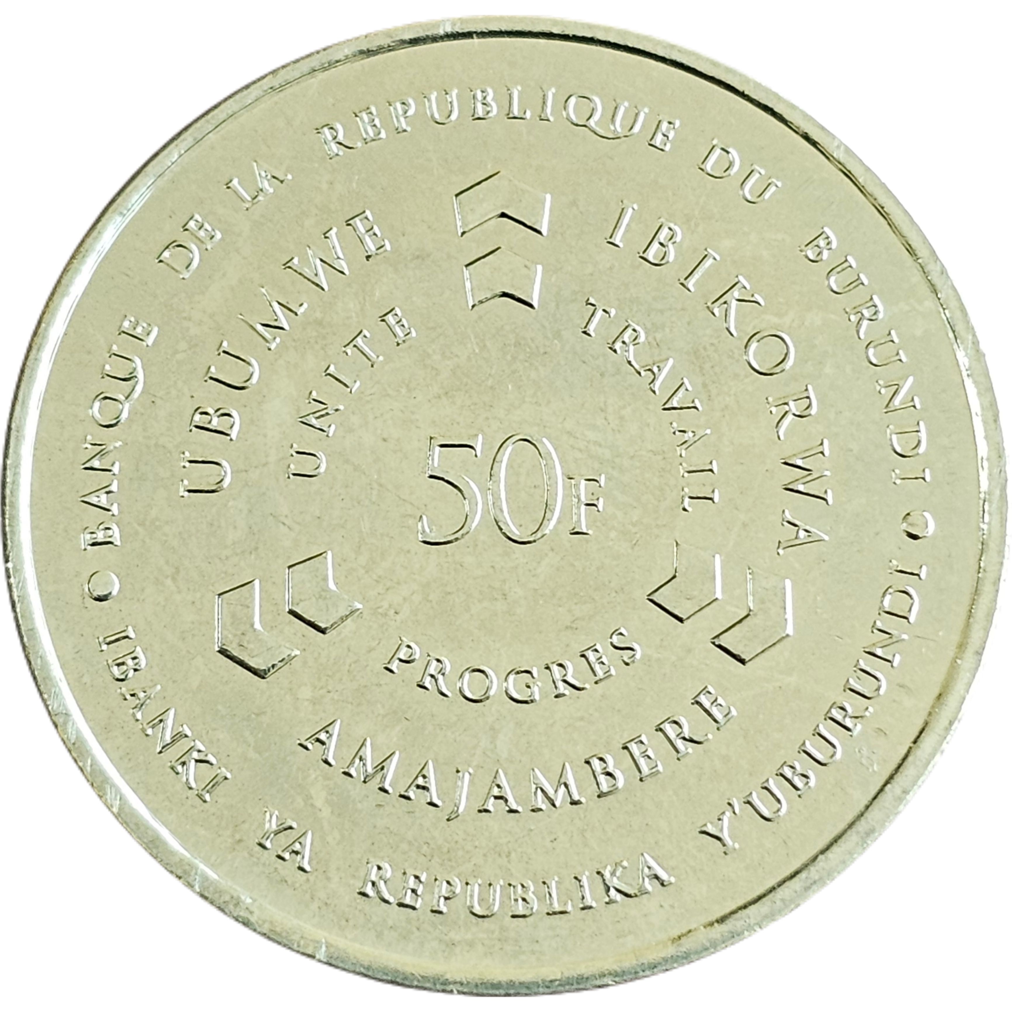 Опис: Легенда у трьох колах французькою та кірунді навколо абревіатури номіналу.