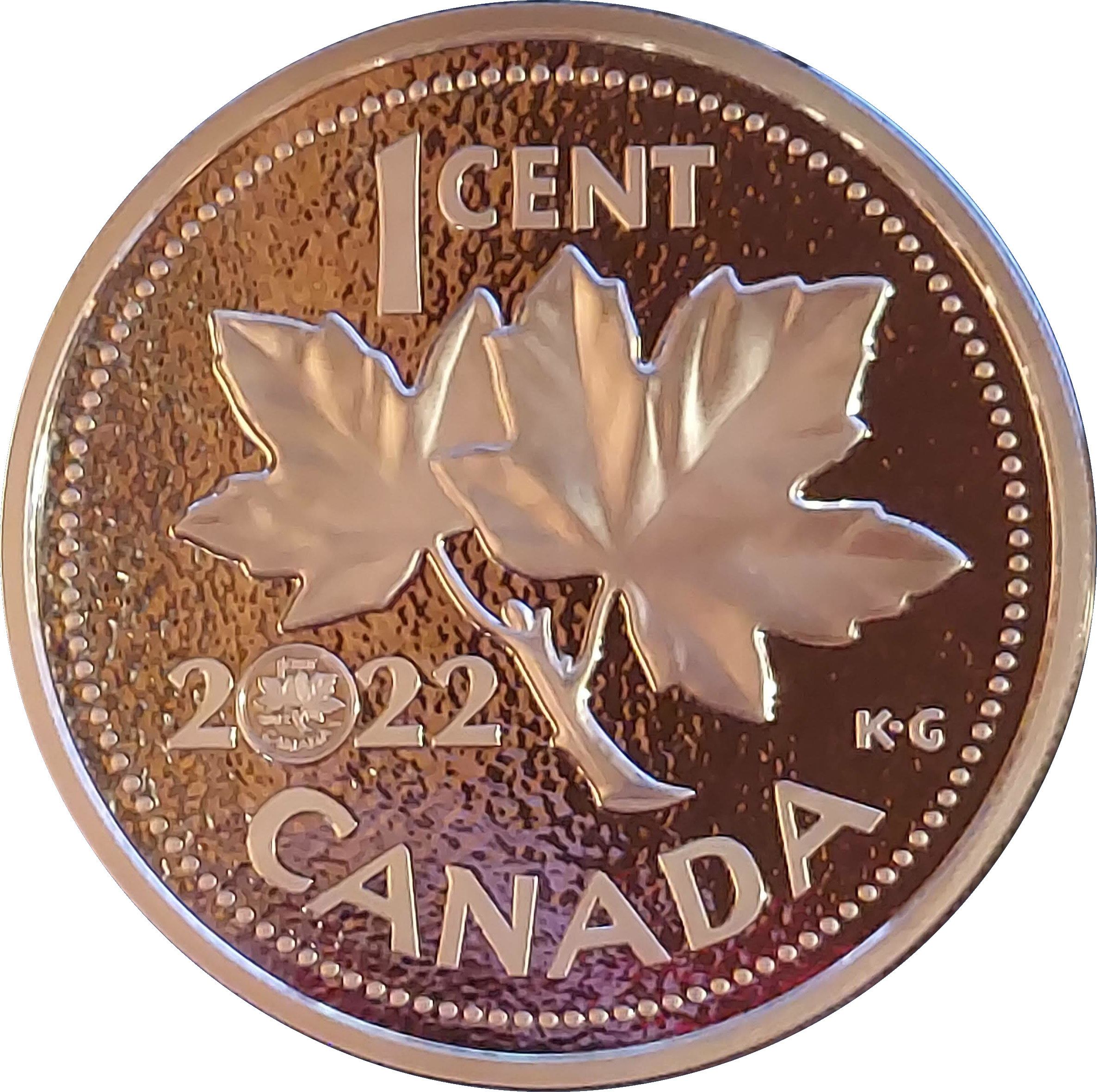 Опис: На зворотному боці монети зображено великоформатне відтворення знакового дизайну гілки кленового листка Г. Е. Крюгера Грея, а відтворення дизайну монети номіналом 1 цент 2012 року утворює цифру «0» у році «2022».
