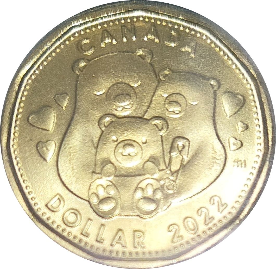 Опис: На зворотному боці монети номіналом 1 долар, розробленої канадським художником Стівом Гепберном, зображено чарівного білого ведмедя, що символізує любов і обійми, які супроводжують появу дитини на світ.