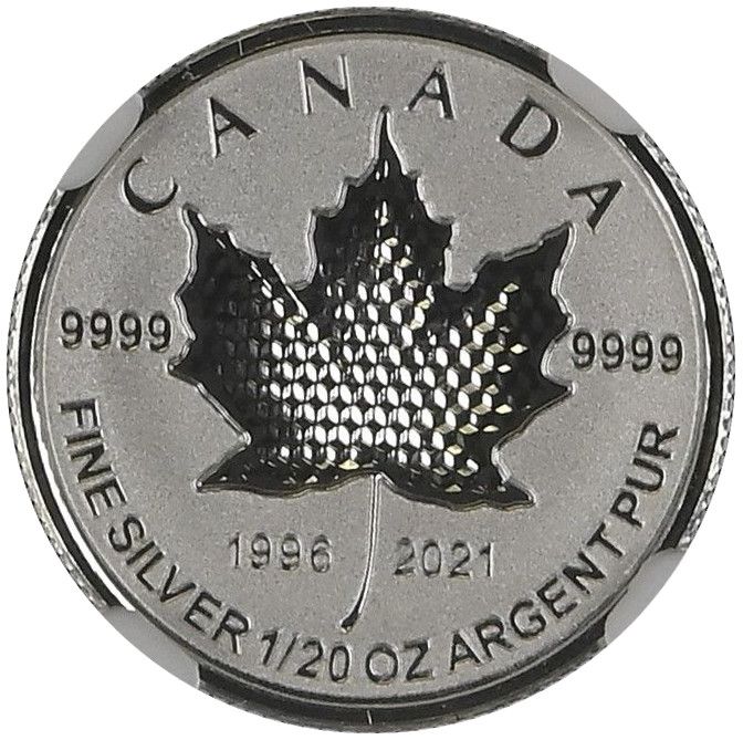 Опис: На монеті зображено дизайн срібної монети «Кленовий лист», виконаний за допомогою технології «пульсуючої» поверхні. Подвійна дата («1996 2021») на честь 25-ї річниці проголошення клена (Acer spp.) національним деревом Канади.