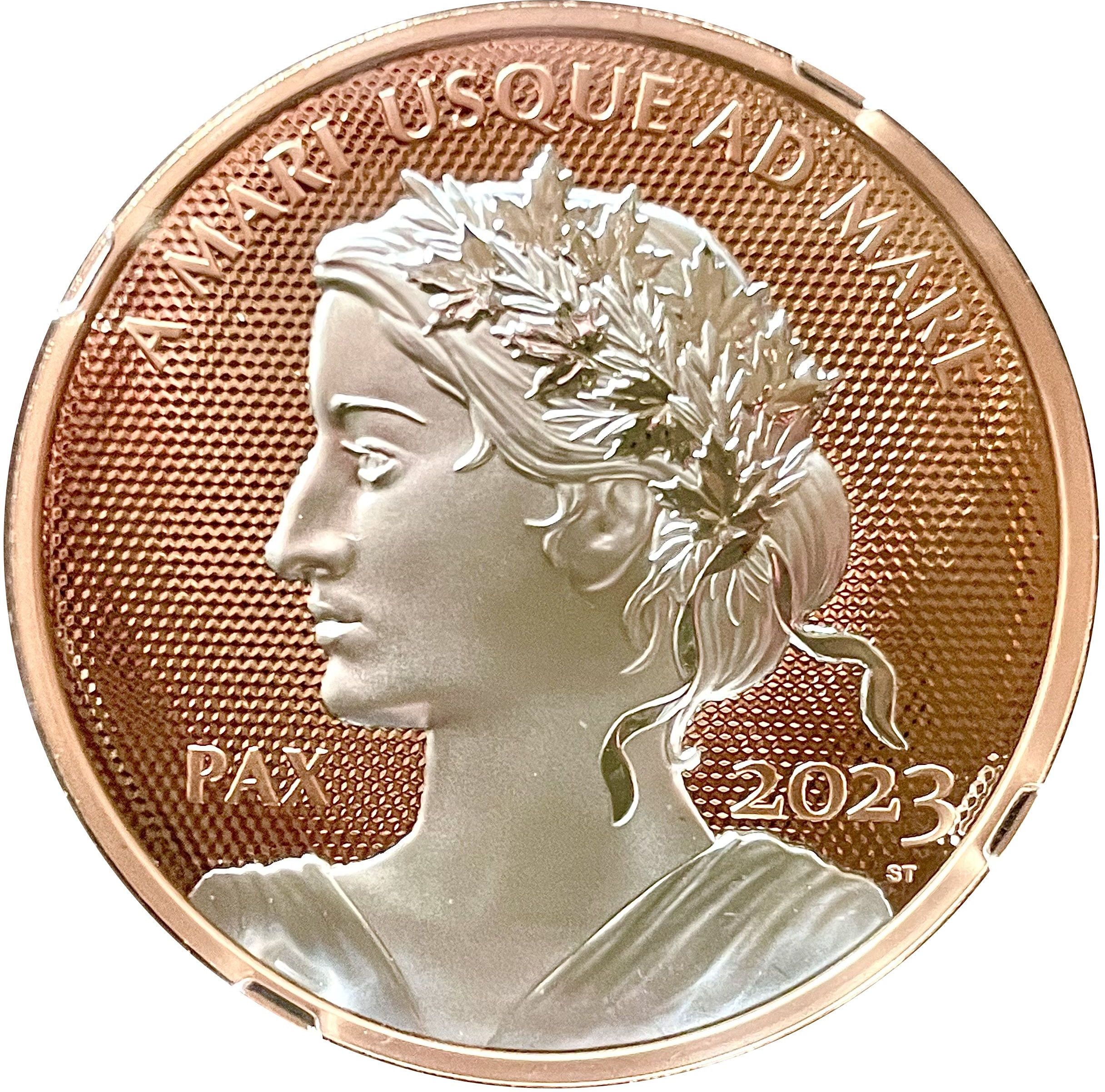 Опис: На реверсі монети «Мирний долар» зображено алегоричний символ миру, покритий рожевим золотом, та пульсуючий візерунок. Монета викарбувана в техніці Ultra High Relief (UHR). На ній зображено профіль Леді Миру з вінком з кленового листя та оливкових гілок на голові.