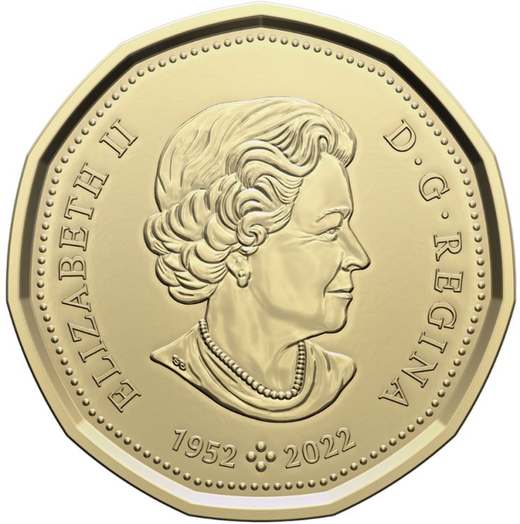 Опис: Голова королеви Єлизавети II у віці 77 років, без головного убору, в намисті та сережках, обернена вправо. Зображення супроводжується спеціальним маркуванням, що складається з подвійних дат «1952» та «2022», розділених чотирма перлинами, які символізують чотири зображення, що прикрашали канадські монети протягом усього правління Єлизавети II.