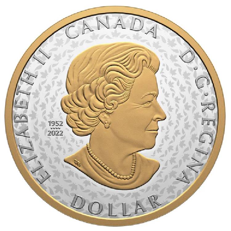 Опис: На аверсі монети зображено голову королеви Єлизавети II у віці 77 років, без головного убору, в намисті та сережках, звернену вправо, з вибірковим покриттям з жовтого золота. Портрет супроводжується спеціальним маркуванням, що складається з подвійної дати «1952» і «2022», розділених чотирма перлинами, які символізують чотири портрети, що прикрашали канадські монети під час правління Єлизавети II. Фон складається з повторюваного візерунка з кленового листя та стрічки.