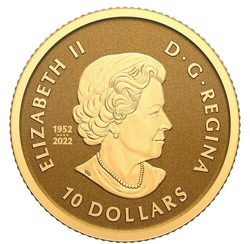 Опис: Голова королеви Єлизавети II у віці 77 років, без головного убору, в намисті та сережках, обернена вправо, вліво, подвійні дати «1952» та «2022», розділені чотирма перлинами, що символізують чотири зображення, які прикрашали канадські монети протягом усього правління. Навколо — напис.