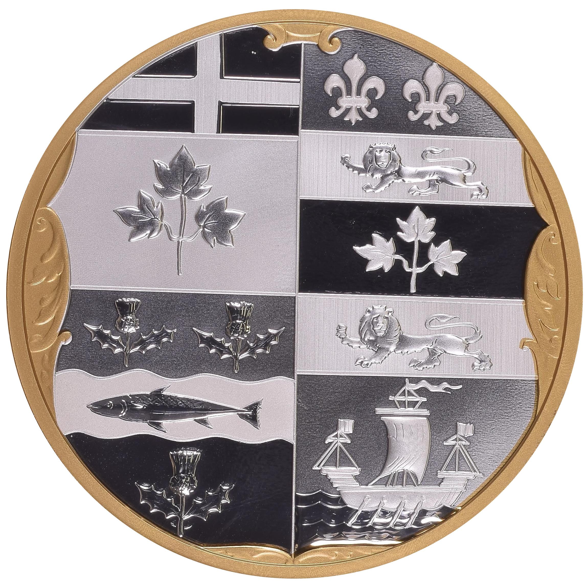 Опис: На зворотному боці монети зображено герб Домініону Канада (1868–1921). Він базується на оригінальному малюнку пером і чорнилом 1868 року, виконаному сером Чарльзом Джорджем Янгом, і включає зміни, запропоновані герцогом Букінгемським. Згідно з королівським указом королеви Вікторії, на щиті Домініону зображено герби перших чотирьох провінцій, що приєдналися до Конфедерації: Онтаріо (хрест Святого Георгія та гілочка з трьома кленовими листками), Квебек (дві лілії, лев, що крокує, та гілочка з трьома кленовими листками), Нова Шотландія (лосось між трьома чортополохами) та Нью-Брансвік (лев, що крокує, і старовинна галера).