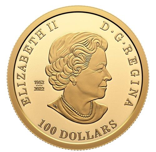 Опис: Голова королеви Єлизавети II у віці 77 років, без головного убору, в намисті та сережках, обернена вправо. Портрет супроводжується спеціальним маркуванням, що складається з подвійних дат «1952» та «2022», розділених чотирма перлинами, які символізують чотири портрети, що прикрашали канадські монети протягом усього правління Єлизавети II.