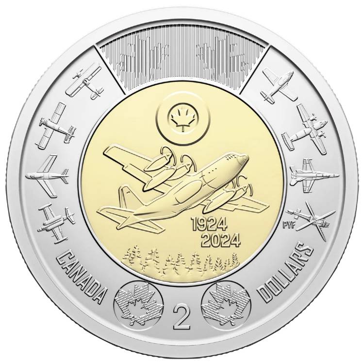 Опис: На реверсі монети зображено 100 років історії Королівських канадських повітряних сил (RCAF), представлених стилізованими зображеннями літаків, на яких літали військовослужбовці RCAF в минулому та сьогоденні. У внутрішній частині зображено емблему RCAF над моделлю H літака CC-130 Hercules, який був основою транспортного парку RCAF протягом понад 60 років; кут нахилу літака Hercules вгору є відсиланням до девізу RCAF Sic itur ad astra («Таким є шлях до зірок»), а подвійна дата «1924 2024» відзначає сторіччя RCAF. На зовнішньому кільці зображено вісім сучасних та історичних літаків RCAF, зверху вниз: Finch Mk. II, CSR-123 Otter, F-86 Sabre Mk. 6 і CF-100 Canuck Mk. 5 з лівого боку; а з правого боку — CT-114 Tutor, CC-115 Buffalo, CF-188 Hornet і вертоліт CH-146 Griffon.