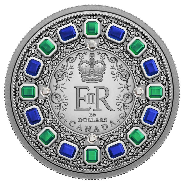 Опис: Королівський монограм королеви Єлизавети II, оточений художнім зображенням імператорської державної корони, як видно зверху. По черзі 8 синіх і 8 зелених скляних каменів оточують реверс, а чотири кристали оточують монограм.
