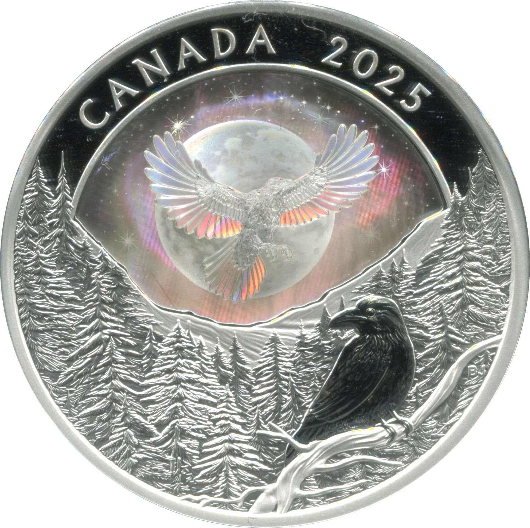 Опис: Два ворони. Перший, зверху, має голографічне зображення і летить на тлі повного місяця та північного сяйва (аврори бореаліс). Другий, знизу, сидить на гілці в лісі. Підпис BJ для Бронсона Жака.