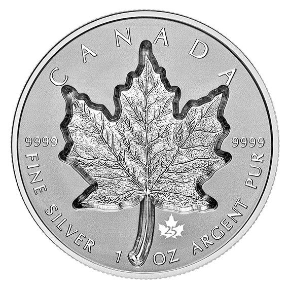 Опис: На реверсі монети зображено культовий дизайн Вальтера Отта — лист цукрового клена, який не змінювався з часу випуску першої срібної монети «Срібний кленовий лист» (SML) у 1988 році. Вперше в історії цей знаменитий кленовий лист викарбувано за технологією Super Incuse, що забезпечує глибину видавлювання 1,5 міліметра. Модифікована обробка реверсу забезпечує акцент на блискучому рельєфі. На реверсі також вигравірувані слова «CANADA» і «FINE SILVER 1 OZ ARGENT PUR», а також стандарт чистоти «9999» і привальний знак «25» у вигляді кленового листка на честь 25-річчя деревного символу Канади — клена (Acer).
