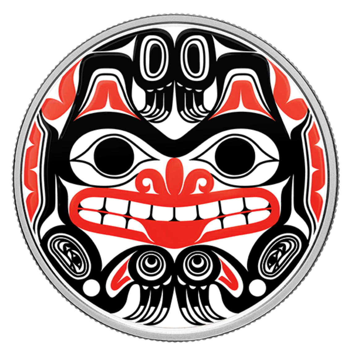 Опис: На зворотному боці монети зображено червоний, білий та чорний кольори над гравіюванням Xhuwaji, Haida Grizzly Bear від відомого художника хайда Білла Рейда (1920-1998).