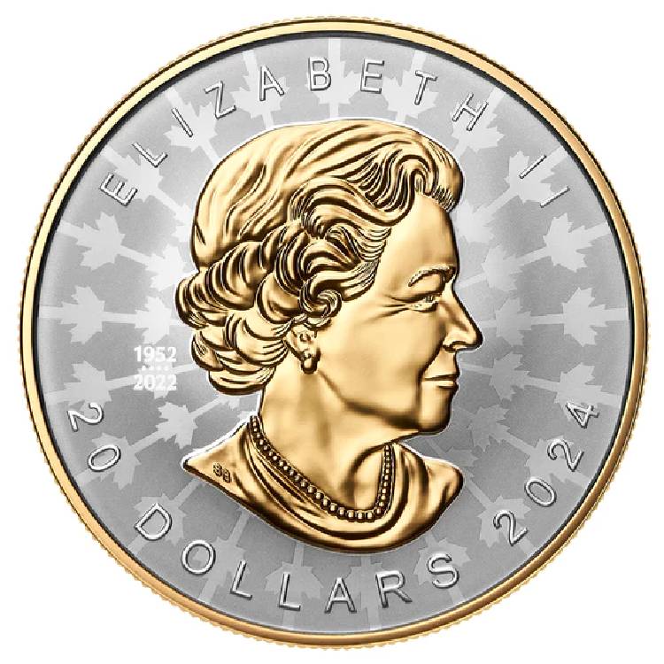 Опис: Візерунок повторюється на аверсі монети, де жовте золоте покриття підкреслює зображення королеви Єлизавети II, голови королеви Єлизавети II, у віці 77 років, без головного убору, в намисті та сережках, обернутої праворуч. Портрет супроводжується спеціальним маркуванням, що складається з подвійних дат «1952» і «2022», розділених чотирма перлами, що символізують чотири портрети, які прикрашали канадські монети під час правління Єлизавети II.
